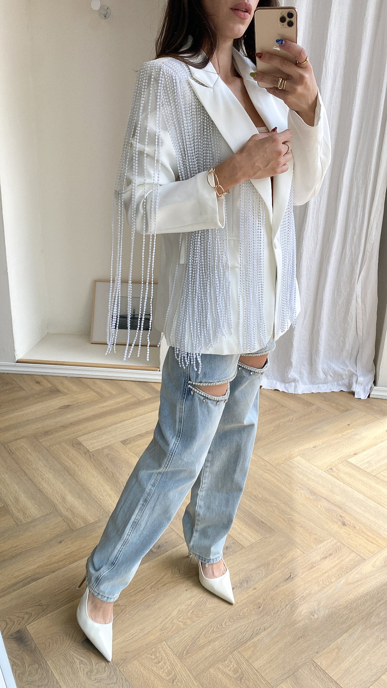 Blazer de cuello solapa y manga larga con hombreras. Detalle de tiras con aplicación en piedra.