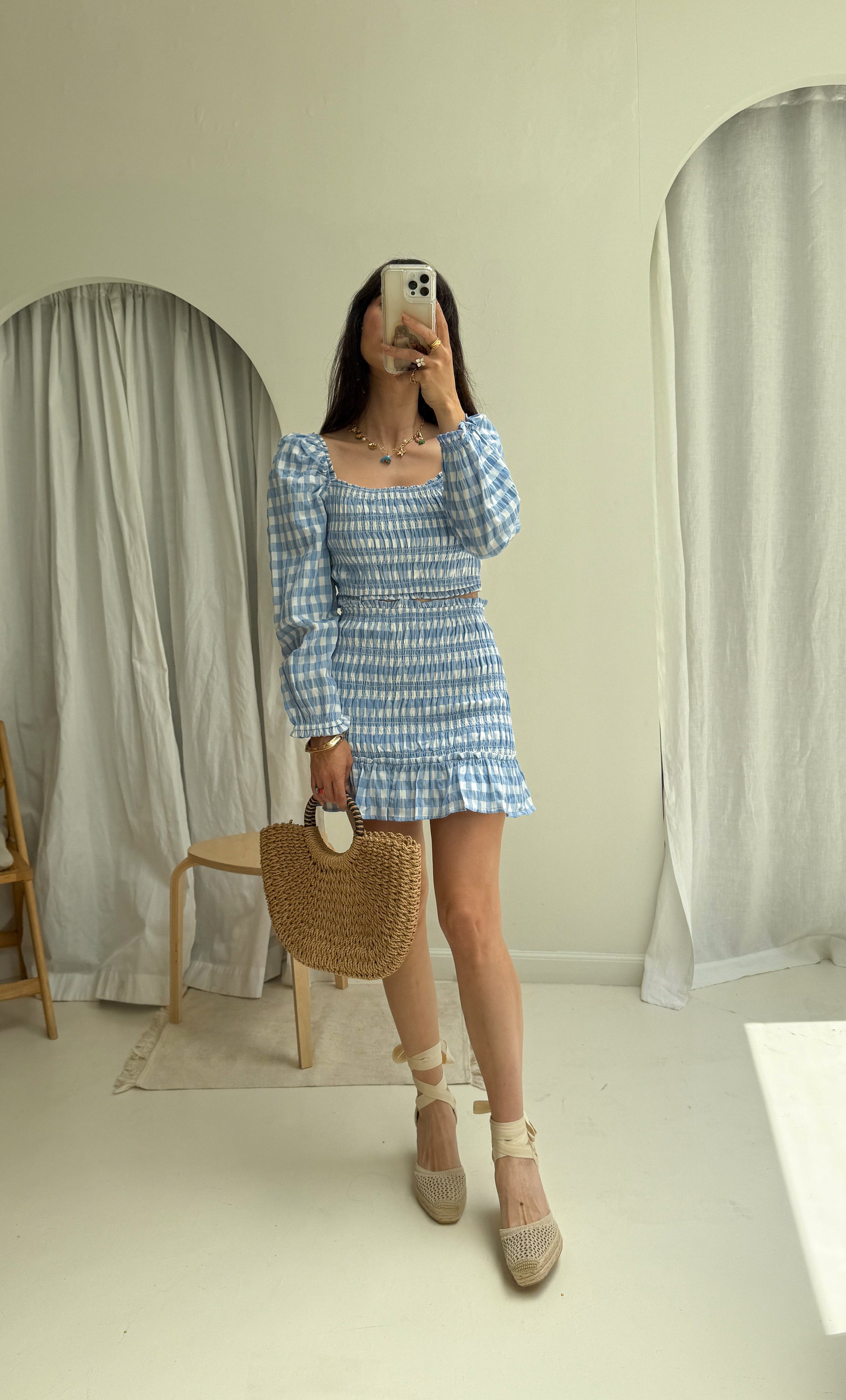 Set de falda corta y camisa con manga larga y olan en puño. Ceñido al cuerpo.