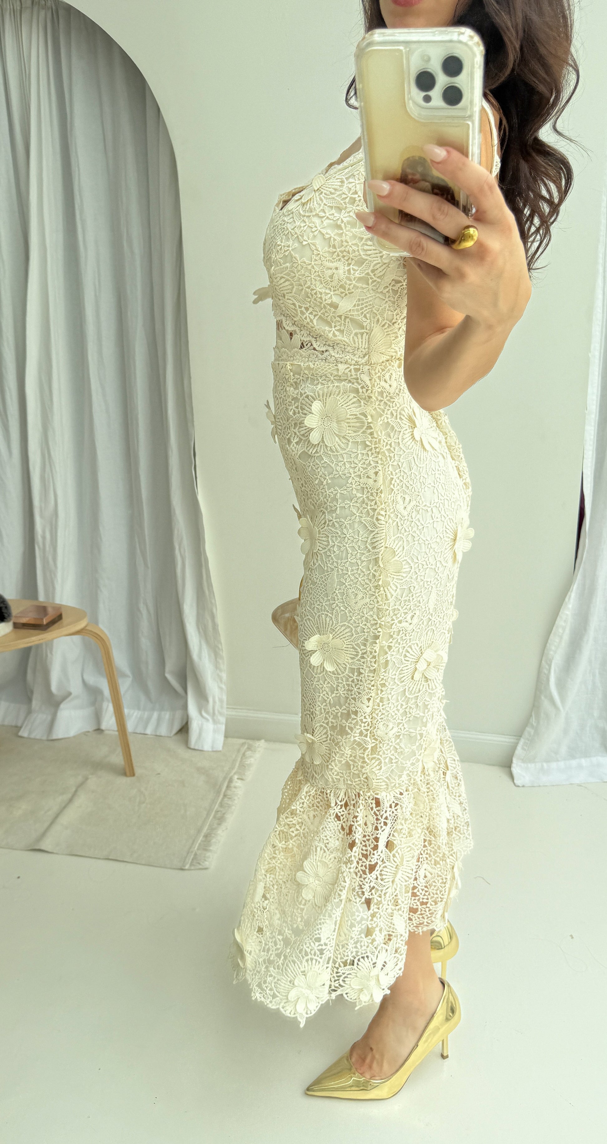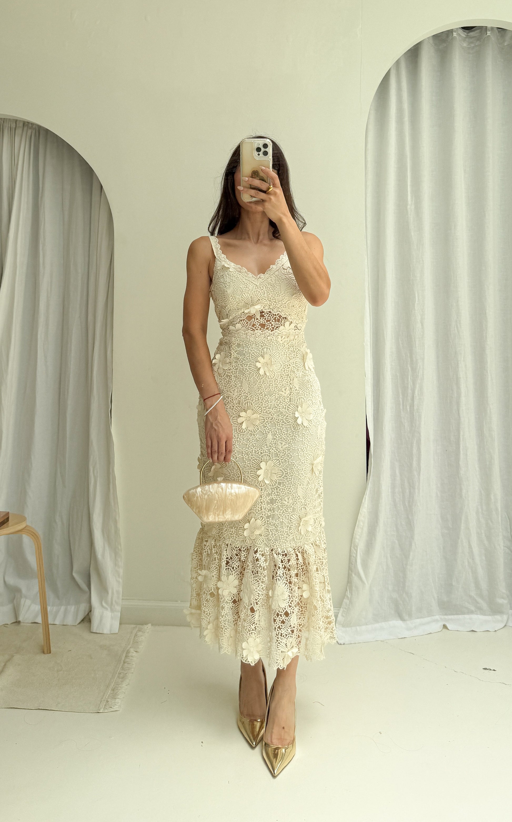 Vestido midi , encaje con flores , tirante