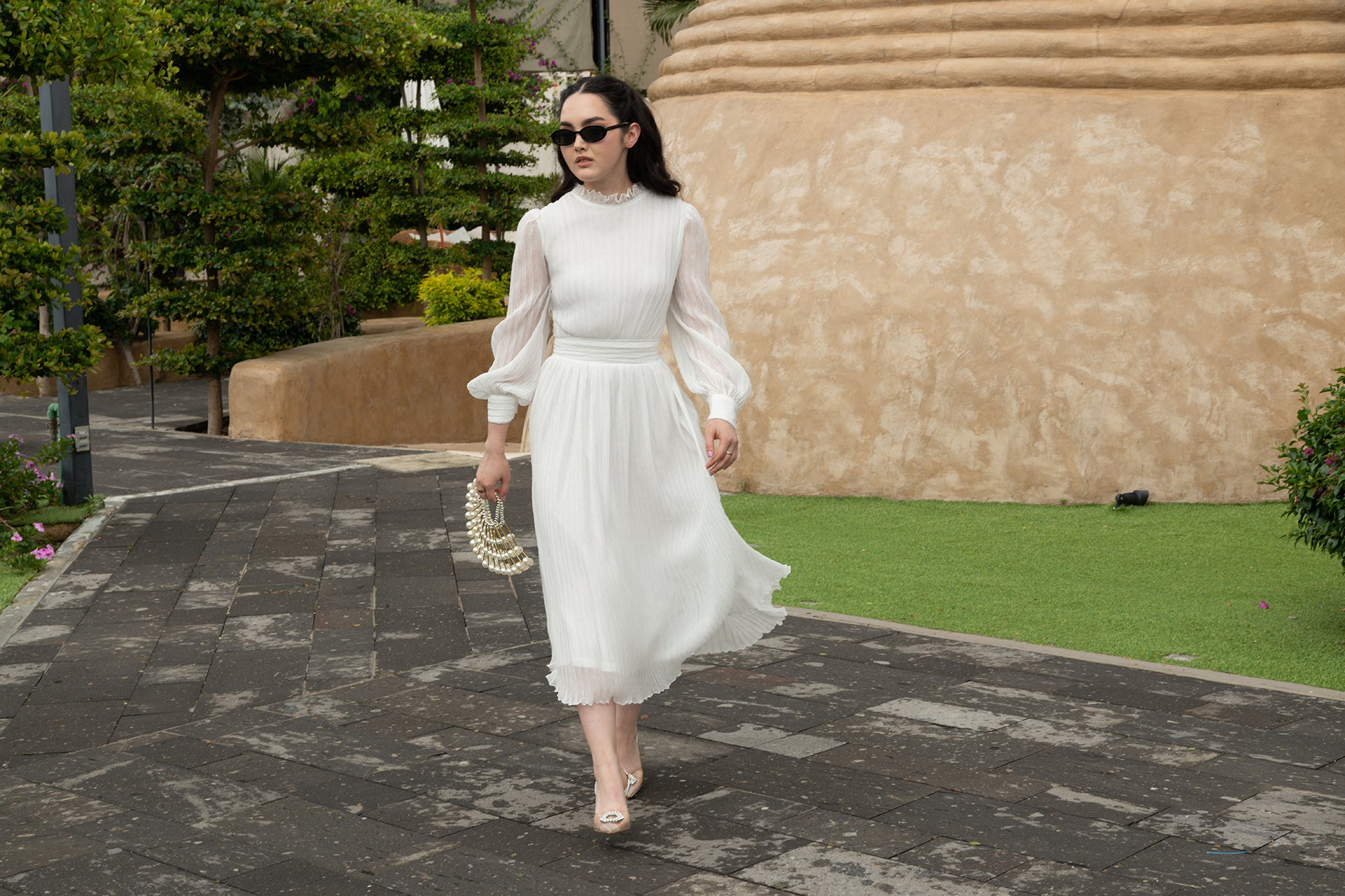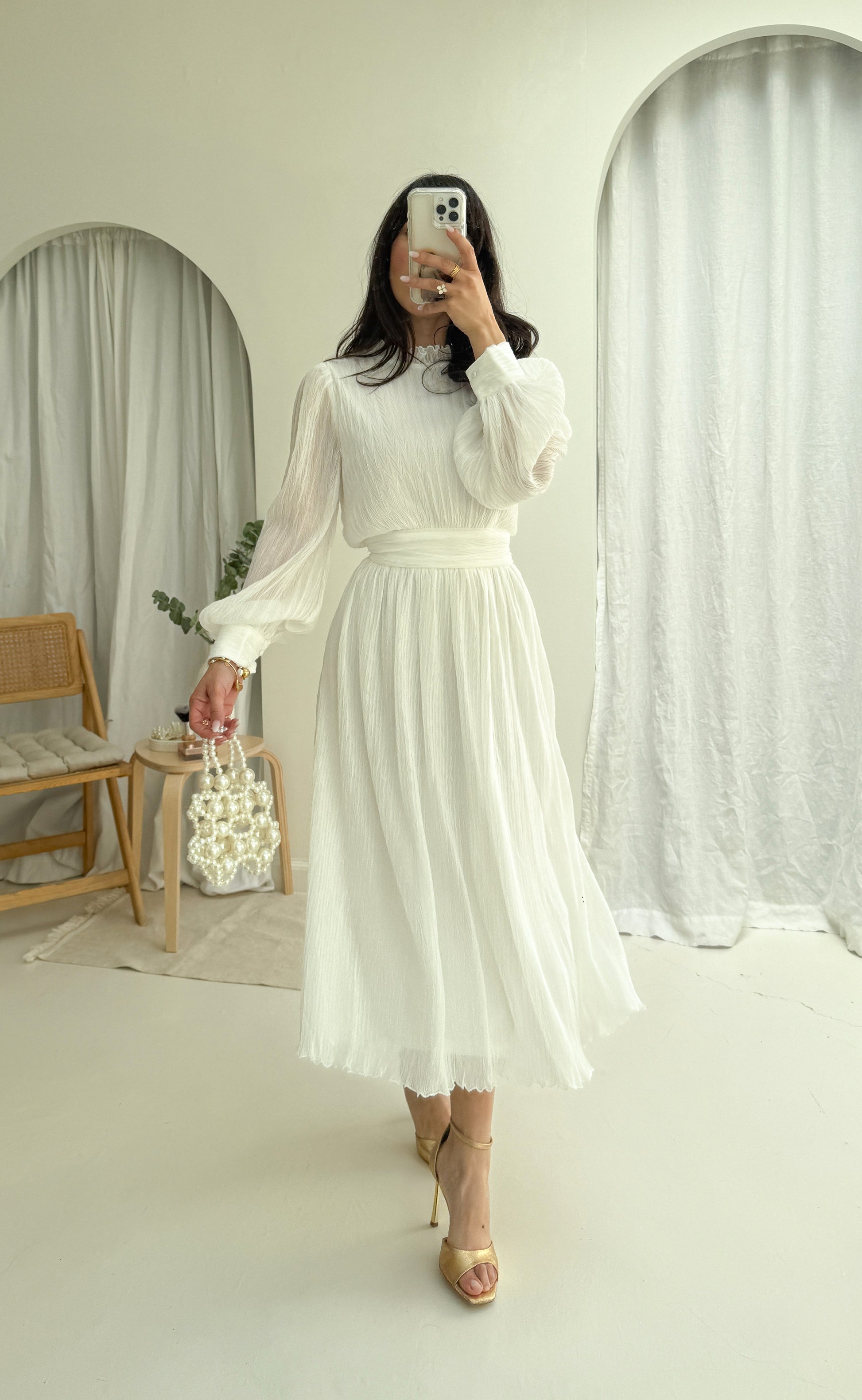 Vestido midi. Cuello redondo y manga larga. Cintura ceñida. Tejido plisado. Bajo fluido.