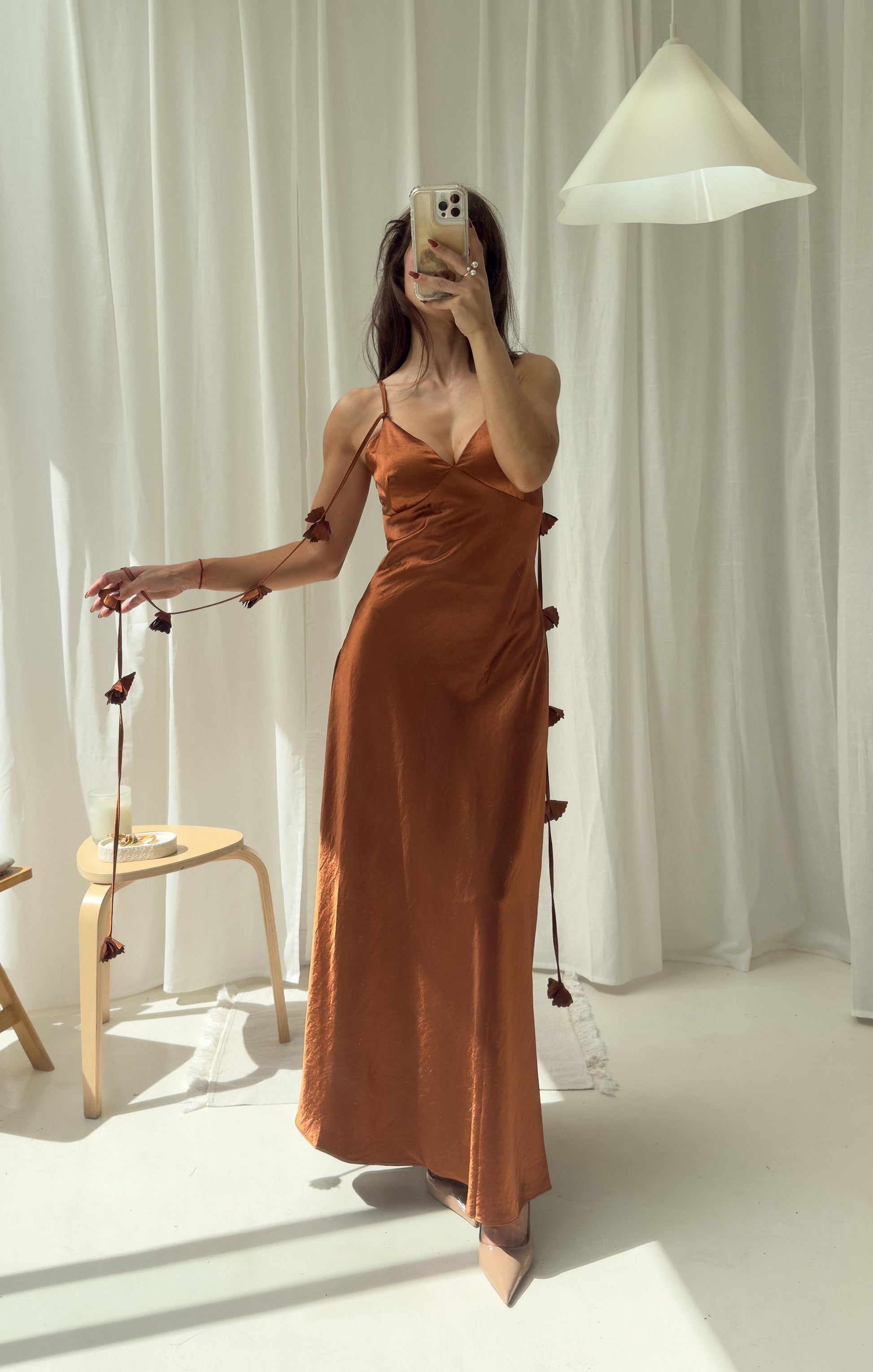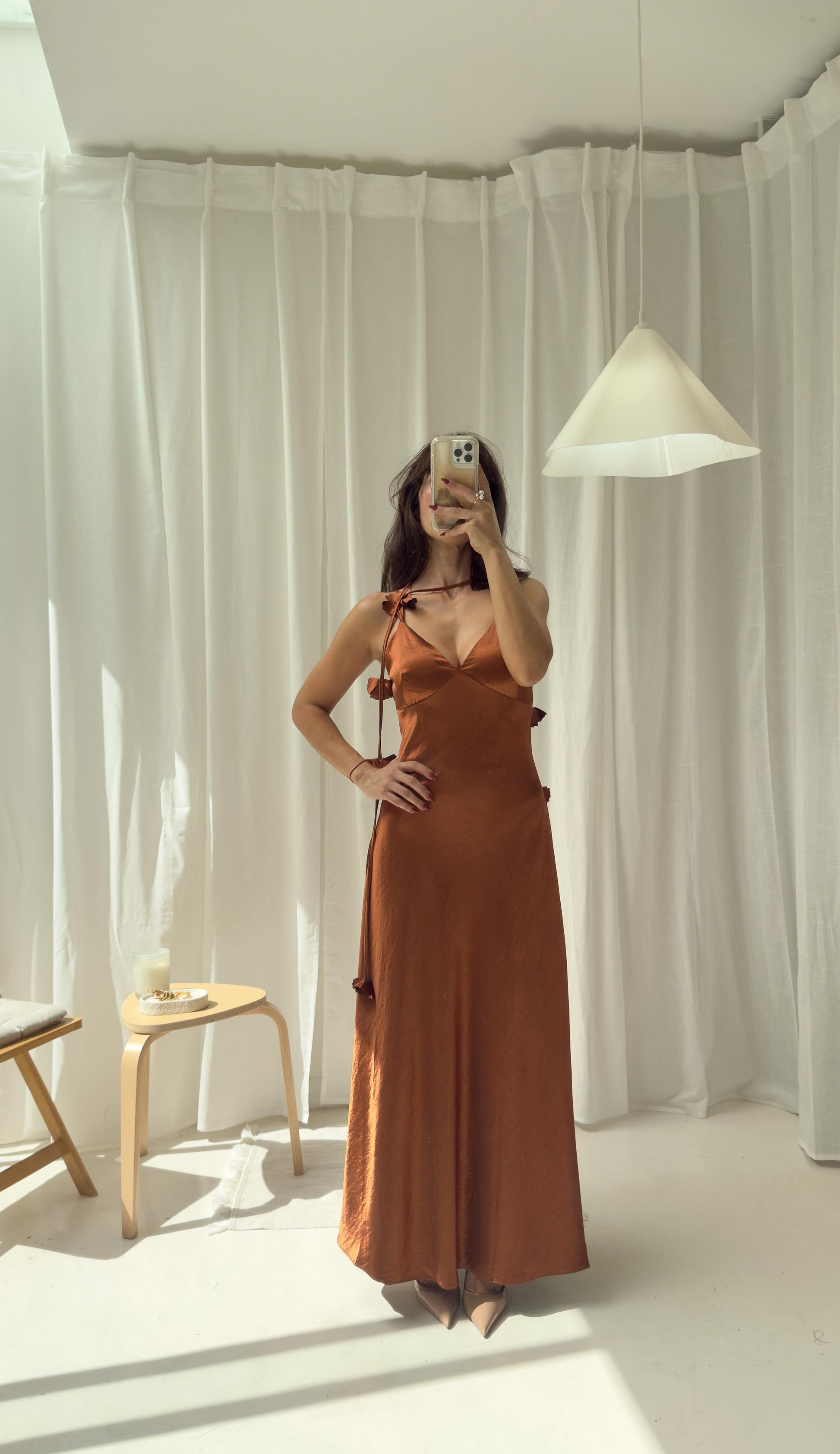Vestido largo tirante ,confeccionado en tela satinada cierre en espalda